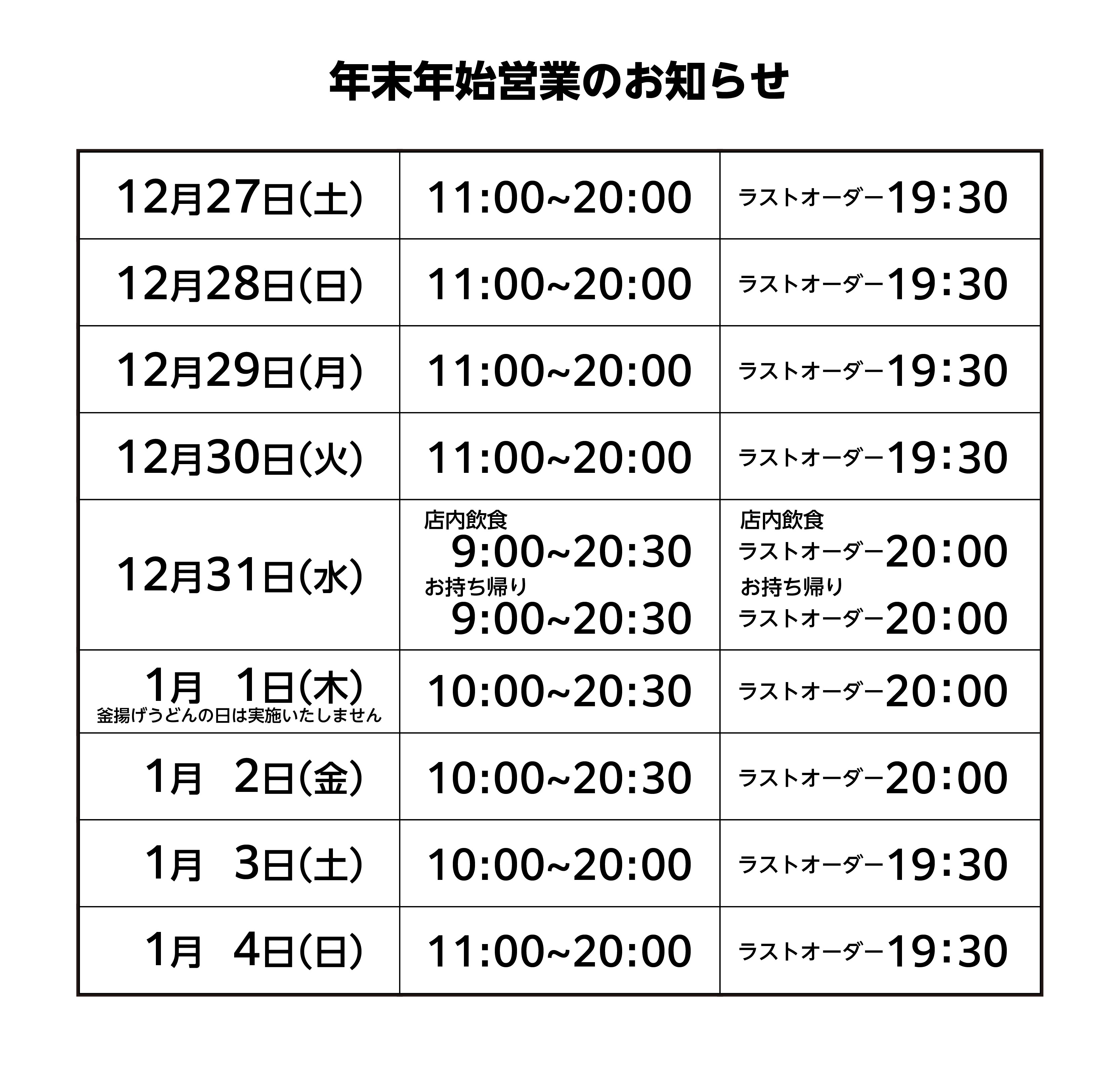 丸亀製麺 年末年始営業のご案内